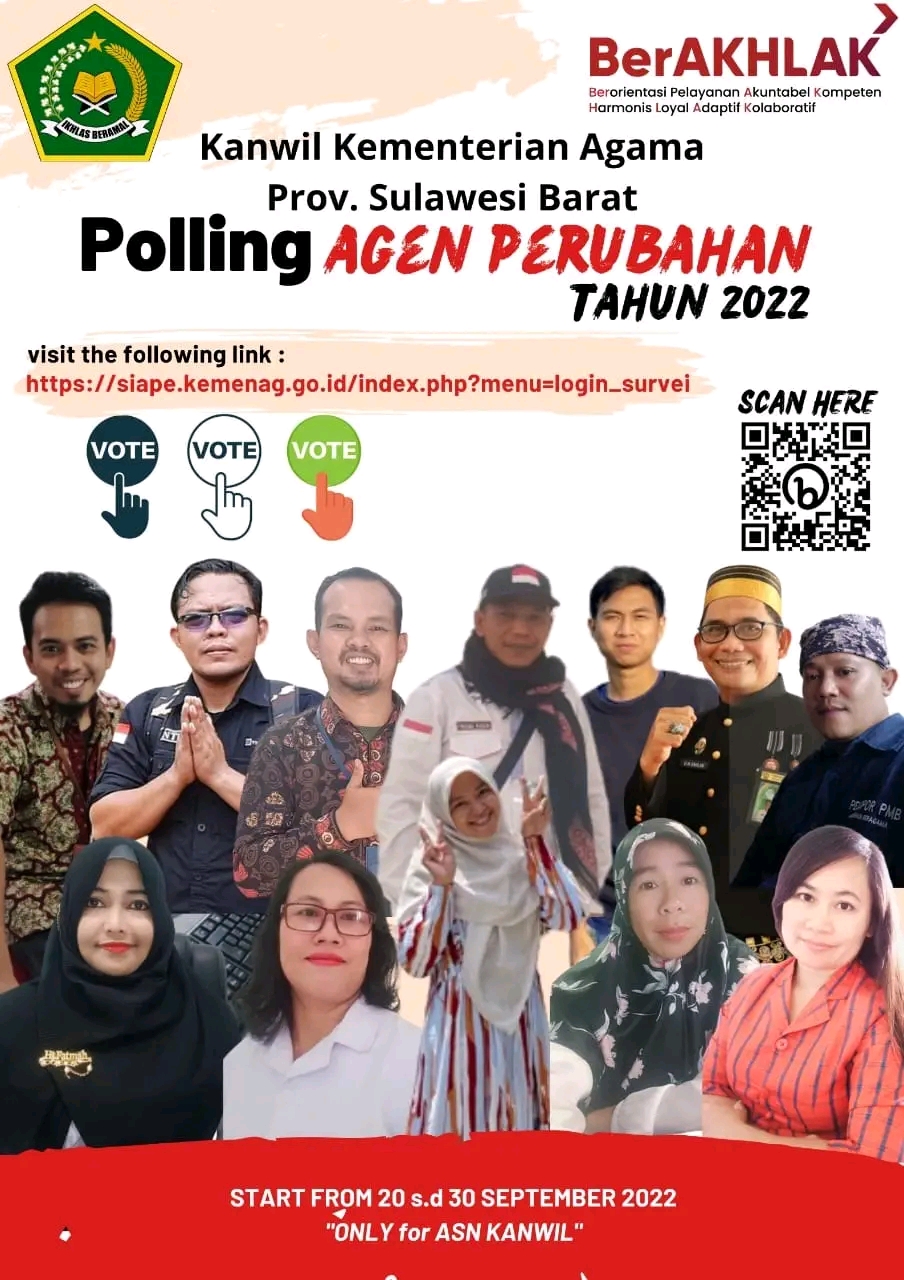 MAMUJU, MATALENSA.ID- Sebanyak 12 Aparatur Sipil Negara (ASN) Kantor Wilayah Kementerian Agama (Kemenag) Provinsi Sulawesi Barat (Sulbar), menjadi kandidat Agen Perubahan 2022, mereka bersaing meraih simpati seluruh ASN Kanwil agar mendapat vote terbanyak.