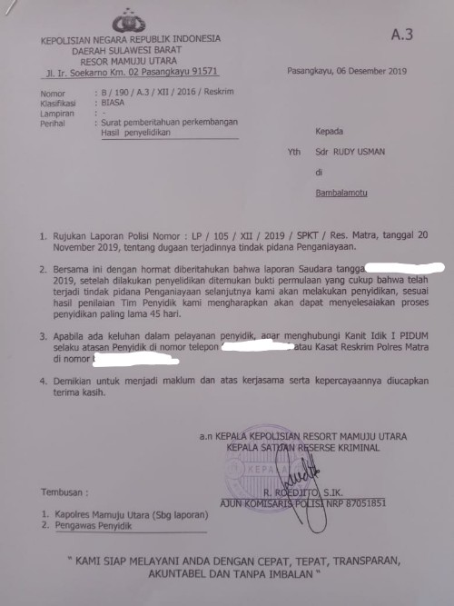 “Saya sudah menerima surat pemberitahuan perkembangan penyelidikan dari Polres Mamuju Utara, kasus ditingkatkan kepenyidikan berarti Kepala Desa sudah status tersangka (TSK),” kata Rudy kepada Wartawan, Jumat (6/11).