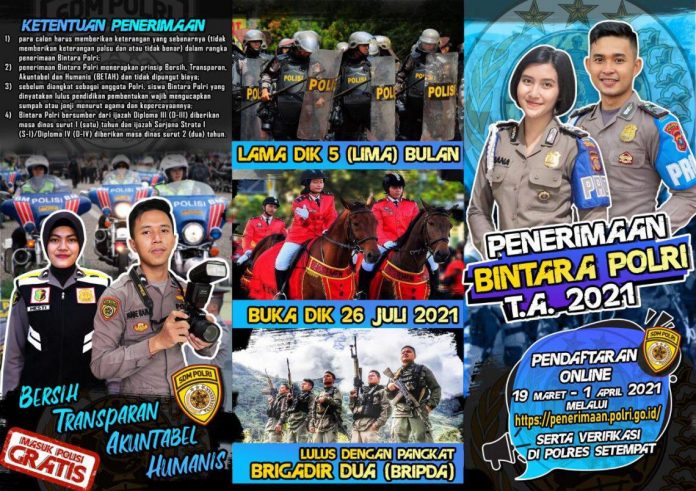Kali ini penerimaan Polri dibuka secara bersamaan baik penerimaan Akademi Kepolisian (Akpol), Bintara, dan Tamtama Polri. Pendaftaran online dan verifikasi calon hingga dokumen dimulai pada 19 Maret – 1 April 2021.