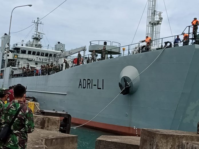Bantuan tersebut kemanusiaan tersebut menggunakan Kapal Angkat darat repubulik Indonesia(ADRI-LI) bermuatan puluhan truck pengangkut sembako