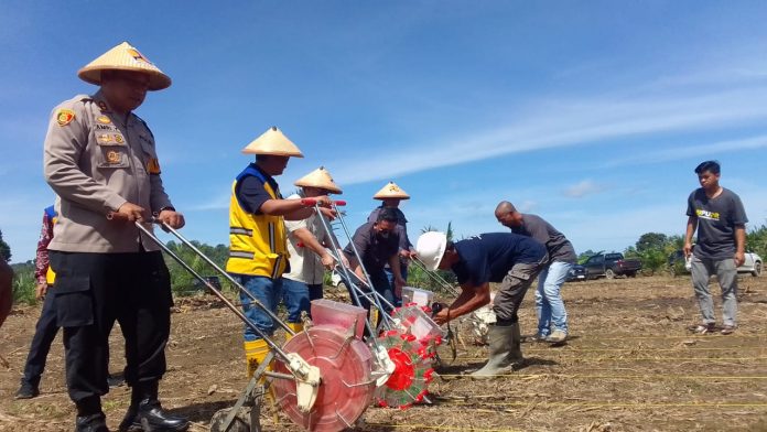 Selain pemberian bantuan benih jagung kepada 10 orang petani juga dilakukan penanaman jagung bersama secara simbolis.