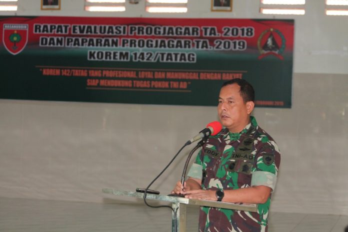 PARE PARE, MATALENSA.ID – – – Danrem 142/Tatag Kolonel Inf. Eventius Teddy Danarto membuka rapat evaluasi Progjagar tahun 2018 dan paparan Progjagar tahun 2019 Korem 142 /Tatag bertempat di Aula Detasemen Perhubungan Jl. Baso Dg Ngerang Pare Pare Prov. Sulsel dihadiri para Kasi, para Dandim, Dan/Kabalak Jajaran Korem 142/Tatag.
