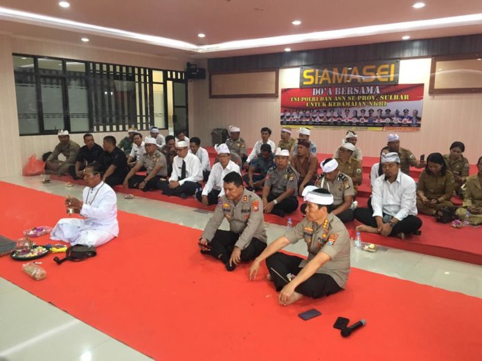 Hal serupa juga dilakukan oleh seluruh personil Polda Sulbar yang beragama Hindu. Dirkrimum dan Dirlantas yang beryakinan sama juga tak ketinggalan mengikuti rutual doa bersama yang dilangsungkan di Ruang Vicon Mapolda, Senin (14/10).