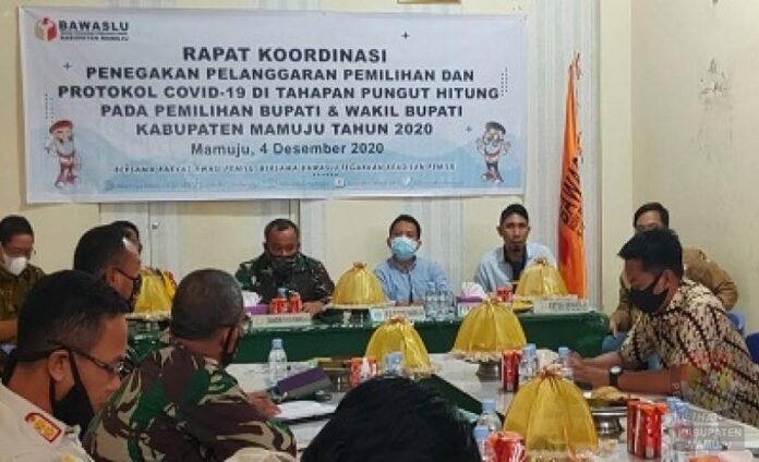 MAMUJU,MATALENSA.ID—Kerumunan orang di Tempat Pemungutan Suara (TPS).Hal itu jadi salah satu topik utama yang dibincang dalam Rakor penegakan pelanggaran pemilihan dan protokol Covid-19 di tahapan pungit hitung, Pilkada Mamuju tahun 2020 yang digelar Bawaslu Mamuju, Jumat (4/12)