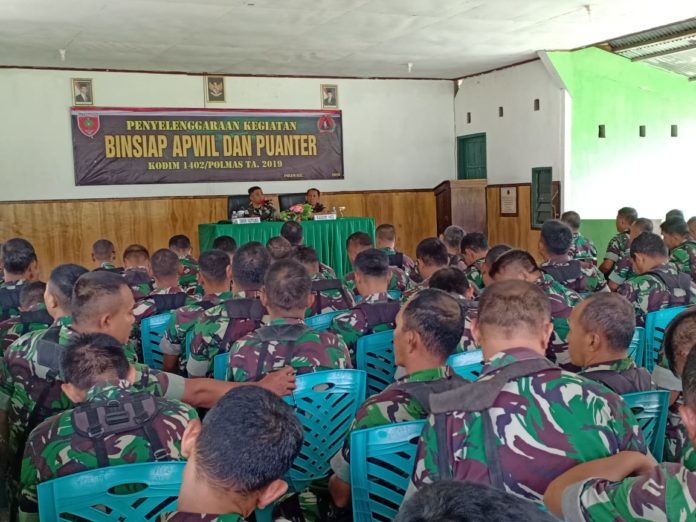 POLMAN, MATALENSA.ID-Netralitas TNI dalam Pemilu menjadi pokok bahasan utama Dandim 1402/Polmas Letkol Arh Dedi Setia Arianto Usai membuka kegiatan Binsiap Apwil dan Puanter yang berlangsung di Baruga Mammesa Kodim 1402/Polmas. Jum’at (12/4)