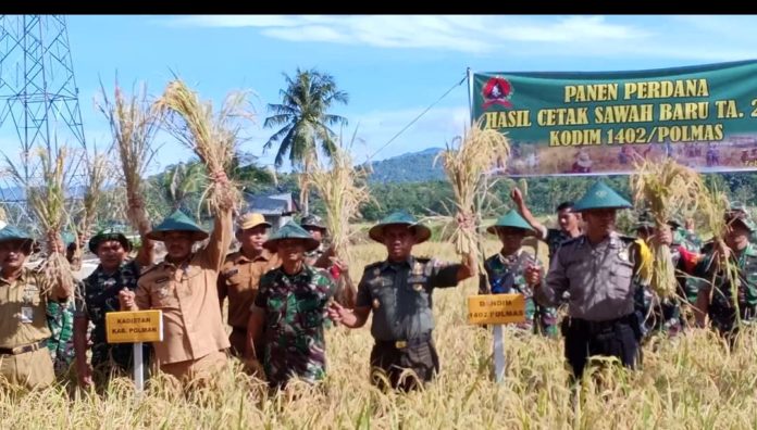 POLMAN,MATALENSA.ID-–– Kodim 1402/Polmas melakukan Panen perdana padi di lahan cetak sawah baru milik kelompok tani kalijodo seluas 7,5 Ha di kelurahan Matakali, Kecamatan Matakali, Kabupaten Polman,Senin (11/02)