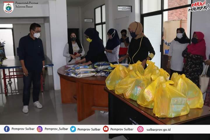 Proses pembagian sembako berlangsung di Kantor Dinas Kominfo, Persandian dan Statistik Sulbar, dengan menerapkan physical distancing atau jaga jarak fisik, untuk mencegah penyebaran Covid-19.