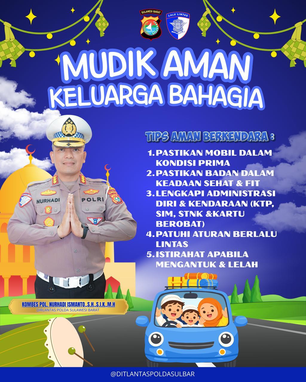 MAMUJU, Dalam menghadapi musim mudik yang akan datang bersamaan dengan bulan suci Ramadan, Direktorat Lalu Lintas (Ditlantas) Polda Sulawesi Barat melalui akun Instagram resminya menyebarkan konten edukatif berupa tips-tips penting untuk memastikan perjalanan mudik berjalan aman dan menyenangkan bagi seluruh keluarga.