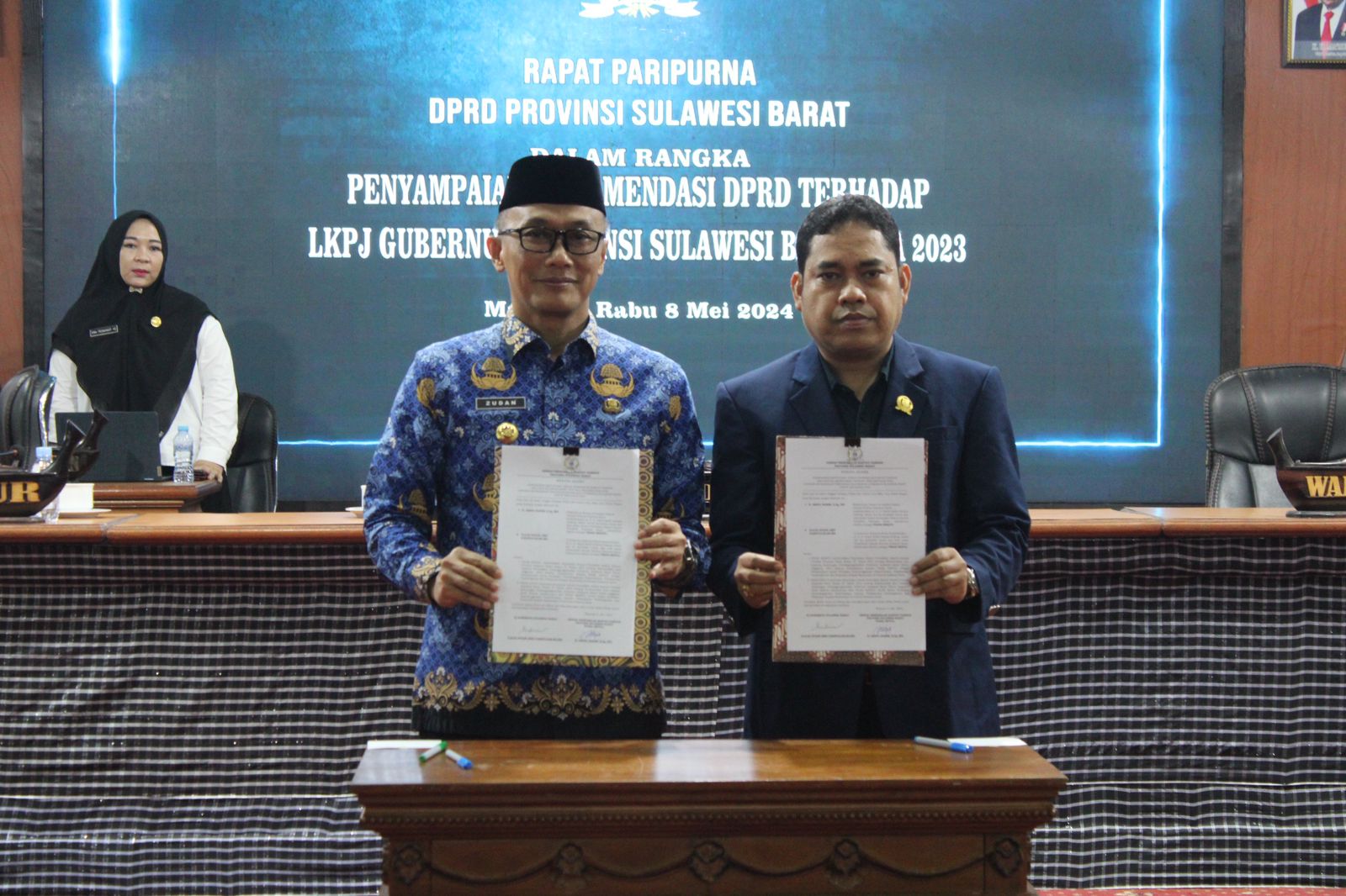 Setelah pelaporan hasil rekomendasi terkait LKPJ Gubernur 2023, acara dilanjutkan dengan Penandatanganan Berkas Rekomendasi dari DPRD Sulbar terhadap LKPJ Gubernur Sulbar.