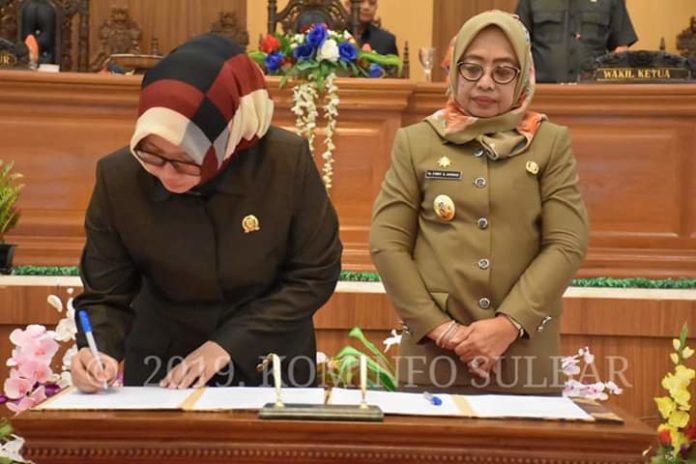 Ketua DPRD Sulbar Hj.Amalia Fitri didampingi Wagub Sulbar Enny Anggareny saat menandatangani berita acara pengesahan 2 Ranperda di gedung DPRD Sulbar
