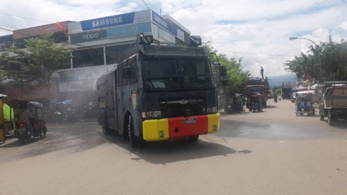Dengan menggunakan kendaraan taktis AWC (Armored Water Cannon), yang memuat ribuan liter cairan disinfektan Satuan Sabhara Polres Polman lakukan penyemprotan Disinfektan di beberapa ruas jalan dalam kota Polewali, hal ini dilakukan sebagai upaya mencegah timbulnya klaster baru penyebaran COVID-19.