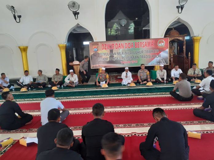 Dalam pelaksanaannya kegiatan Dzikir dan doa bersama ini mengakat tema pemulian nilai-nilai luhur pancasila dalam rangka pembinaan tradisi polri tahun 2019.