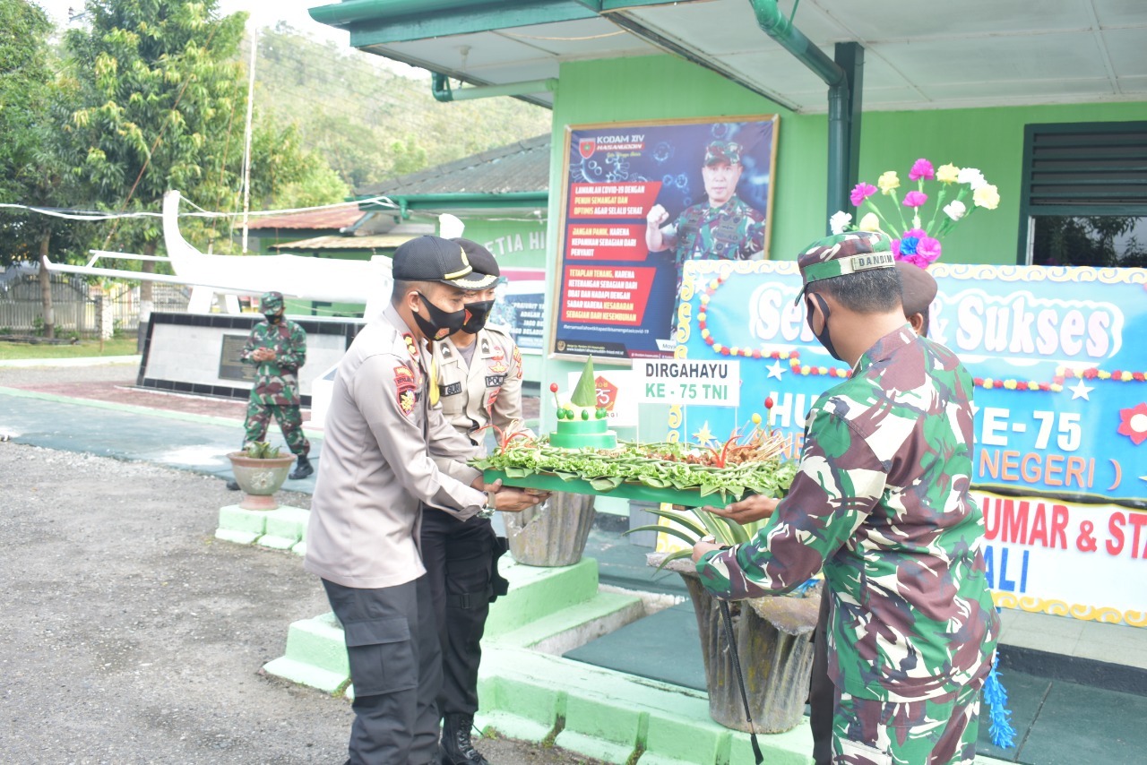 Kapolres Polewali Mandar AKBP Ardi Sutriono., SIK, beserta jajaran sambangi Markas Kodim 1402/Polmas dengan membawa kejutan nasi tumpeng dan Kue ulang tahun kepada TNI di Makodim 1402/Polmas.