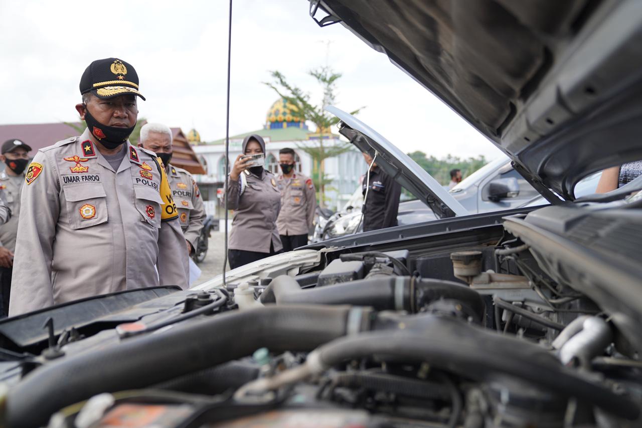 Dalam pelaksanaannya, Wakapolda Sulbar Brigjen Pol Umar Faroq didampingi Karo Log Kombes Pol Mukhamad Safei memeriksa kondisi dan kelayakan kendaraan dinas roda 4 dan Roda 2.