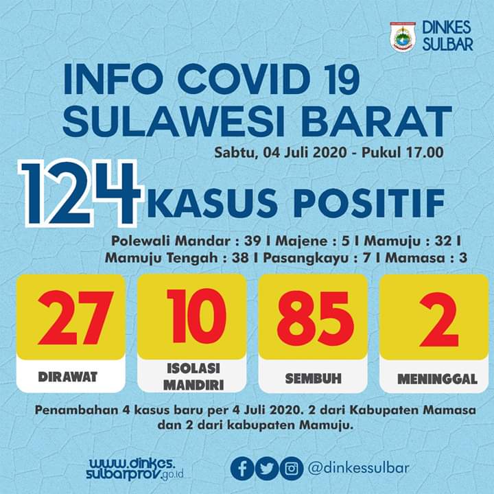 “Sebelumnya kami menyampaikan bahwa Hasil Lab yang akan kami release hari ini adalah hasil pemeriksaan dari TCM RS Regional Mamuju , tanggal 3 JULI 2020 Yaitu ada 4 orang penambahan kasus positif. Dari kabupaten Mamuju 2 kasus dan dari kabupaten Mamasa 2 kasus.”Kata Juru bicara Gugus Tugas Covid 19