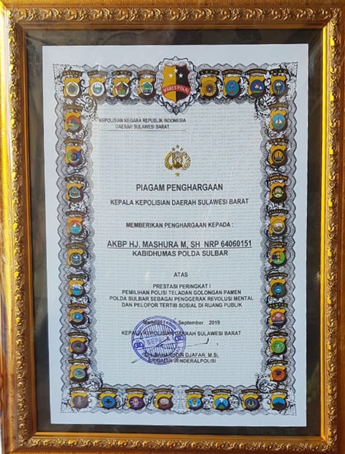 MAMUJU,MATALENSA.ID – Kepala Bidang Hubungan Masyarakat (Kabid Humas) AKBP Hj. Mashura mendapat penghargaan sebagai Polisi teladan penggerak revolusi mental dan pelopor tertib sosial di ruang publik terbaik di sulbar.