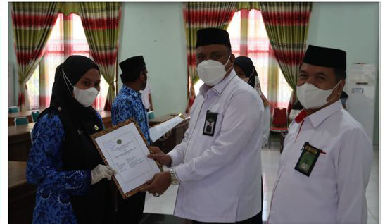 MAMUJU, MATALENSA.ID— Kepala Kantor Wilayah Kementerian Agama Provinsi Sulawesi Barat H. M. Muflih B Fattah didampingi Kabag TU H. Suharli dan menyerahkan Surat Kepetusan (SK) Calon Pegawai Negeri Sipil (CPNS), Senin (14/3/2022).