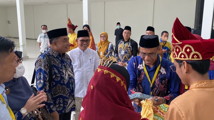 H. Syafrudin Baderung bersama ibu ketua DWP Hj. Armida Hanum Siregar tiba di bumi lambung mangkurat dengan pesawat Garuda pukul 14.25, disambut dengan pengalungan kain sasirangan oleh Kankemenag Kabupaten Tanah Bumbu
