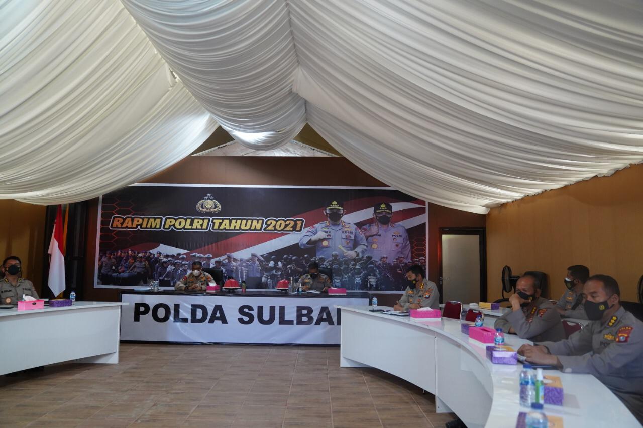 Di tempat terpisah, Kapolda Sulbar Irjen Pol Eko Budi Sampurno bersama pejabat utama mengikuti Rapim secara Virtual di ruang Vicon Mapolda Sulbar, Selasa (16/02).