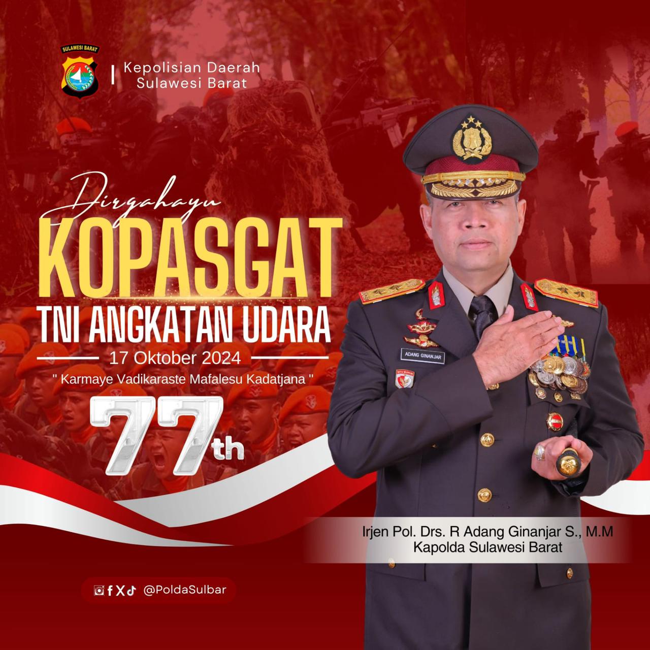MAMUJU, MATALENSA.ID – Irjen Pol Adang Ginanjar, Kapolda Sulawesi Barat (Sulbar), turut merayakan hari ulang tahun ke-77 Tentara Nasional Indonesia Angkatan Udara (TNI AU) dengan penuh suka cita. Melalui unggahan di media sosial resmi Polda Sulbar, Kapolda menyampaikan ucapan selamat dan harapannya untuk TNI AU.