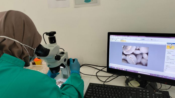 Bertempat di laboratorium Karantina Sulawesi Barat, Instiarni selaku Pejabat karantina dengan cermat melakukan pemeriksaan menggunakan mikroskop terhadap biji kopi sebanyak 120 kilogram yang dilaporkan oleh Yakob, Rabu (13/12).