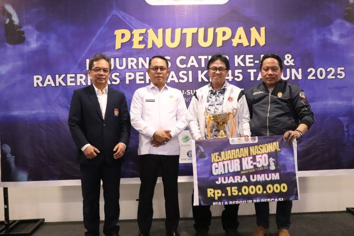 MAMUJU,MATALENSA.ID – Sekprov Sulbar, Junda Maulana secara resmi menutup Kejuaraan Nasional (Kejurnas) Catur ke-50 dan Rapat Kerja Nasional (Rakernas) Percasi ke-45 tahun 2025 di Ballroom Hotel Maleo Town Square (Matos) Mamuju, Rabu 12 November 2025.