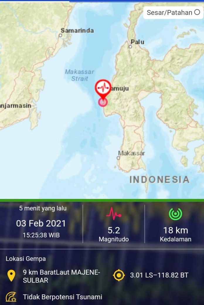 MAMUJU,MATALENSA.ID–Kejadian dan Parameter Gempabumi.Hari Rabu, 03 Februari 2021 pukul 15.25.38 WIB wilayah Selat Makassar diguncang gempa tektonik. Hasil analisinqs BMKG menunjukkan gempabumi ini memiliki parameter update dengan magnitudo M=5,1. Episenter gempabumi terletak pada koordinat 2,99 LS dan 118,86 BT, atau tepatnya berlokasi di darat pada jarak 6 km arah barat laut Majene, Sulawesi Barat pada kedalaman 17 km.