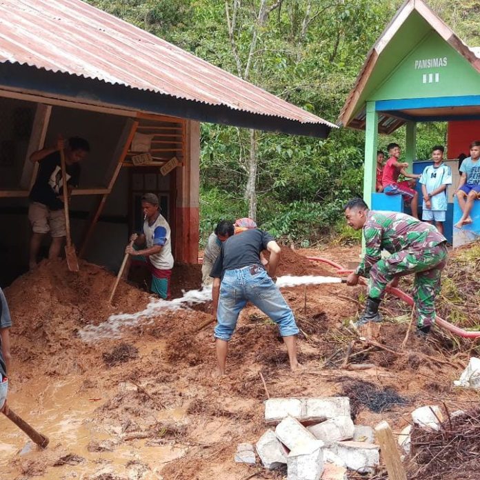 MAMASA, MATALENSA. ID—Anggota TNI dari Koramil 1402-08/Sumarorong hingga Hari ke-4 pasca bencana Banjir yang melanda Desa Batang Uru Kecamatan Sumarorong Kab. Mamasa yang terjadi Kamis 7 Maret lalu maksimalkan pembenahan fasilitas umum.