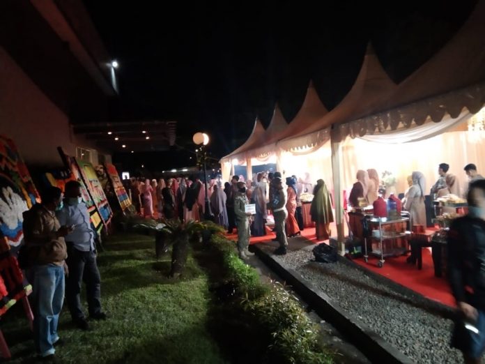 Lanjutannya, Di Dalam ruangan acara, jumlah tamunya masih memenuhi ketentuan yang berlaku yakni dibawah 25 persen dari jumlah daya tampung ruangan, hanya kerumunan diluar gedung yang tadi kita urai, termasuk penutupan pintu gerbang masuk supaya tamu tidak lagi masuk ke area gedung acara.