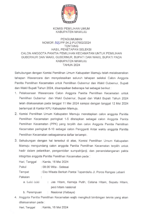 KPU Kabupaten Mamuju menetapkan calon anggota PPK peringkat 1-5 sebagai anggota terpilih, sementara peringkat 6-10 ditetapkan sebagai calon Pengganti Antar Waktu (PAW). Daftar terlampir.