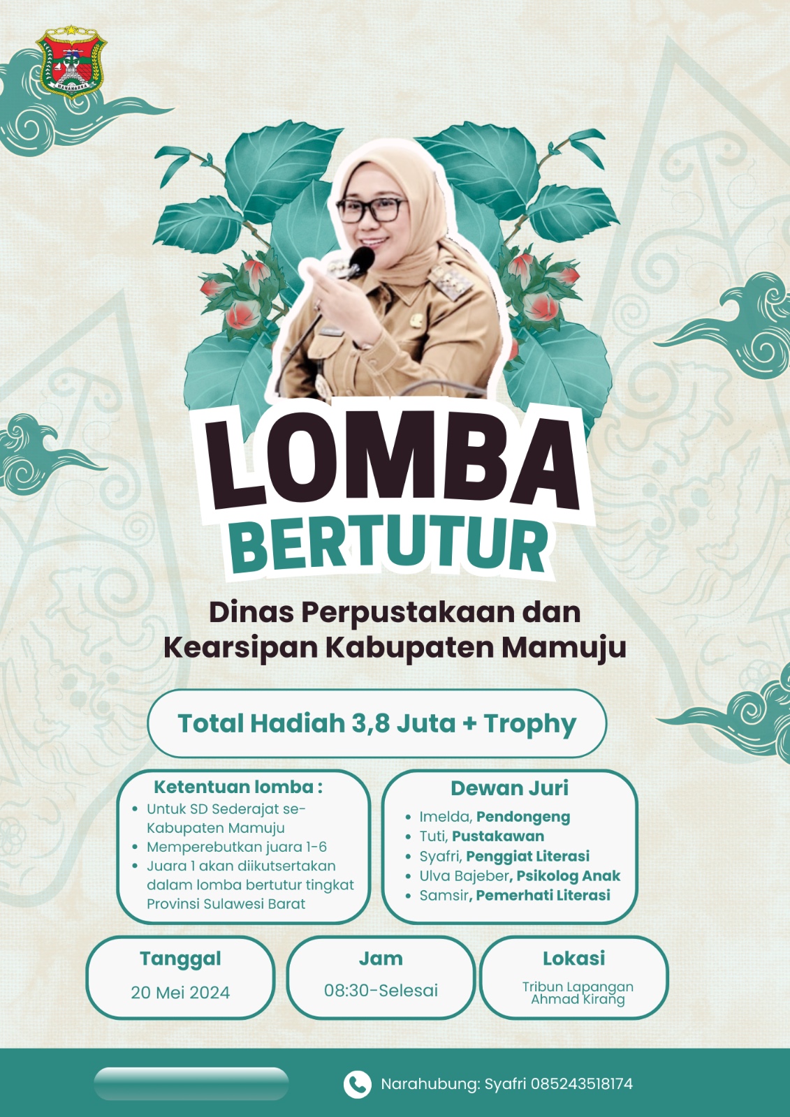 Dalam upaya untuk terus mewariskan cerita-cerita rakyat yang kaya akan pesan-pesan moral dan adat-istiadat di tataran masyarakat, Dinas Perpustakaan dan Kearsipan (Dispusip) kabupaten Mamuju menggelar Lomba Bertutur tingkat Kabupaten yang akan dilaksanakan pada Senin, 20 Mei 2024.