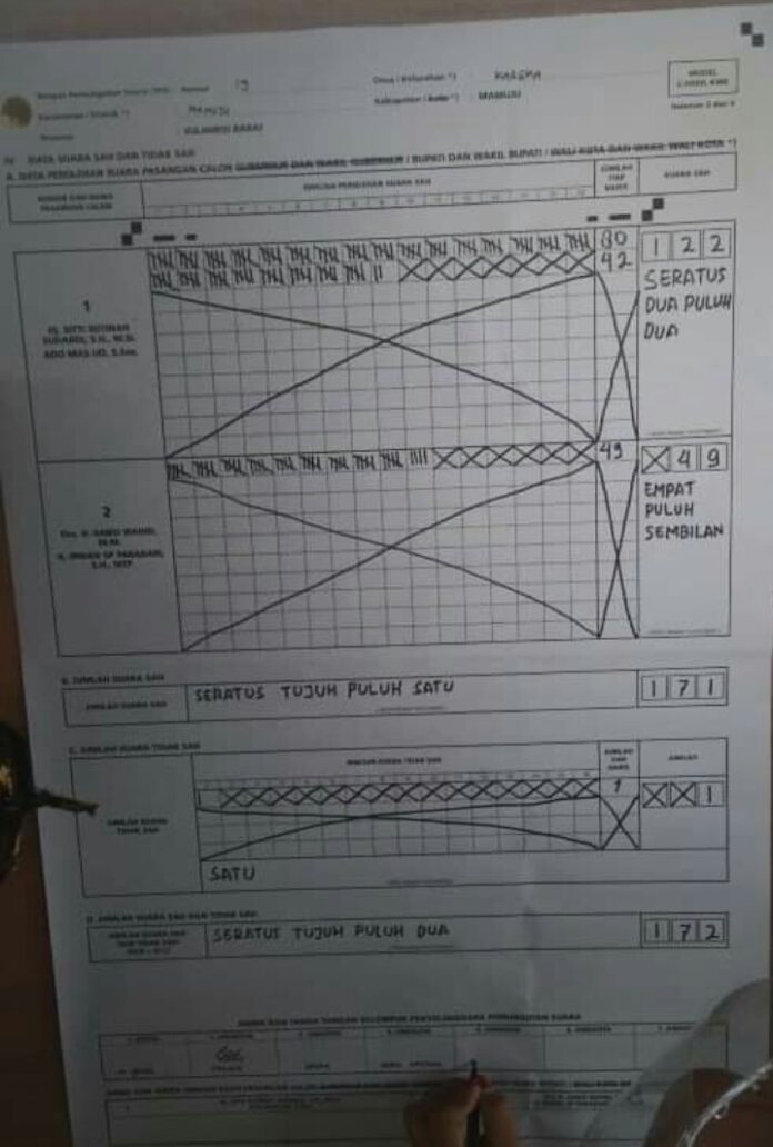 MAMUJU,MATALENSA.ID- Pasangan Calon Bupati dan Wakil Bupati nomor Urut 1 (Tina-Ado) kembali Meraup suara terbanyak salam pelaksaan Pemungutan Suara Ulang( PSU) pada TPS 19 di karema Kelurahan Kerema kecamatan Mamuju kabupaten.Minggu (13/12)