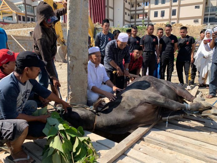 Penyembelihan hewan qurban yang berlangsung di depan Masjid Jabal Rahma Polda Sulbar dipimpin langsung oleh Kapolda Sulbar dan dihadiri para pejabat utama, ibu ketua bhayangkari PD Sulbar dan masyarakat sekitar.