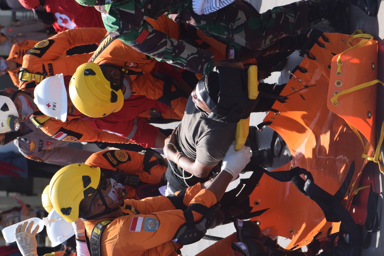 Usai pelaksanaan upacara, Tim SAR gabungan dari Korem 142 Tatag, Sat Samapta Polda Sulbar, Sat Brimob dan Basarnas Provinsi Sulbar langsung memperagakan simulasi penanggulangan bencana dengan menyelamatkan 2 orang korban bencana alam yang terjebak di lantai 2 gedung.