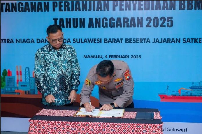 MAMUJU, MATALENSA.ID — Polda Sulawesi Barat (Sulbar) melalui Biro Logistik resmi menandatangani perjanjian kerjasama (MoU) penyediaan Bahan BakarMinyak (BBM) dengan PT. Pertamina Patra Niaga Regional Sulawesidan Pelumas untuk tahun 2025 yang dilaksanakan di Hotel Grand Maleo Mamuju, Selasa (4/2/25)