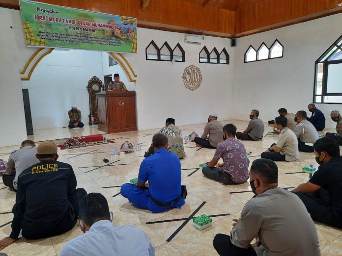 Kepolisian Resor Majene dalam hal ini juga tak ketinggalan melaksanakan kegiatan perayaan Isra’ Mi’raj Nabi Besar Muhammad Sallalahi Alaihi Wasallam 1442 H, Kamis (18/3/21) di Masjid Nurul Ikhlas Mapolres.