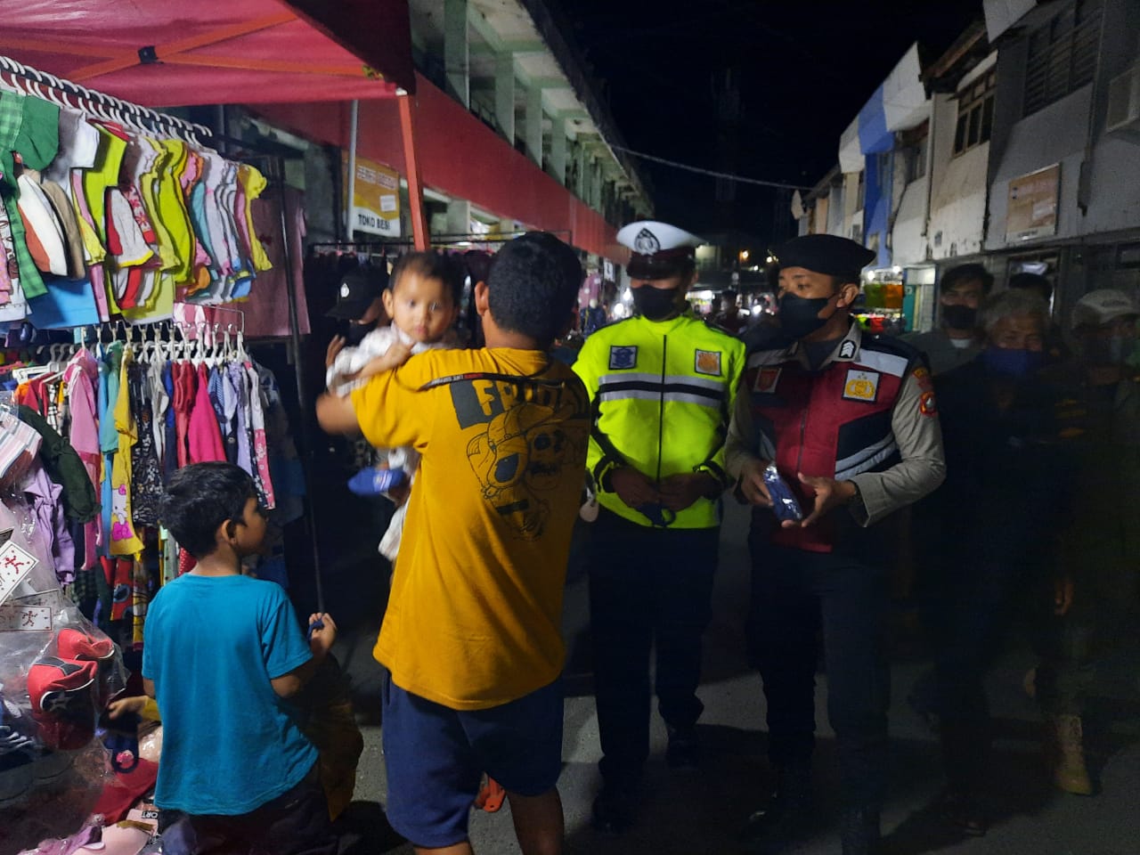 Tak hanya sibuk mengajak dan menghimbau masyarakat agar tetap disiplin prokes, pihaknya juga berbagi masker gratis kepada para pedagang maupun pengunjung pasar malam.