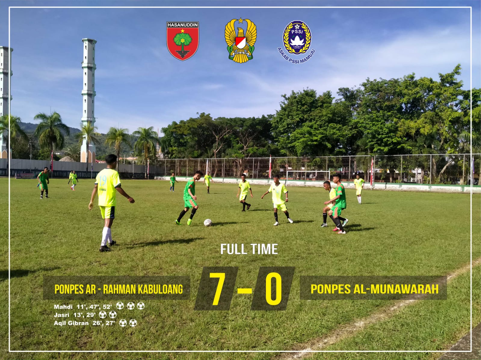 Hasil pertandingan tersebut, Ponpes Al Rahman berhasil mengalahkan Ponpes Al Munawwara dengan skor cukup telak 7-0. Pemain-pemain dari Ponpes Al Rahman benar-benar menguasai jalannya pertandingan. Pada babak pertama mereka menguasai separuh lapangan. Santri Ponpes Al Rahman memborbardir pertahanan Ponpes Al Munawwarah. Skor 7-0 ini bertahan hingga wasit meniup peluit panjang sebagai tanda berakhirnya pertandingan.