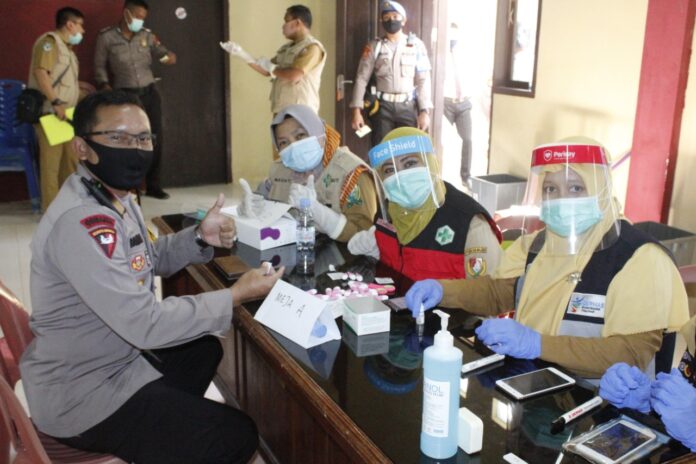 Terlihat Kapolres Majene AKBP Irawan Banuaji, SIK, M.Si Bersama Wakapolres Majene, para pejabat utama Polres Majene serta personil Polres Majene antusias ikut melakukan rapid tes yang dilaksanakan oleh Dinas Kesehatan Kabupaten Majene dengan melibatkan petugas medis dari Puskesmas yang ada diwilayah Kecamatan Banggae dan Banggae Timur.