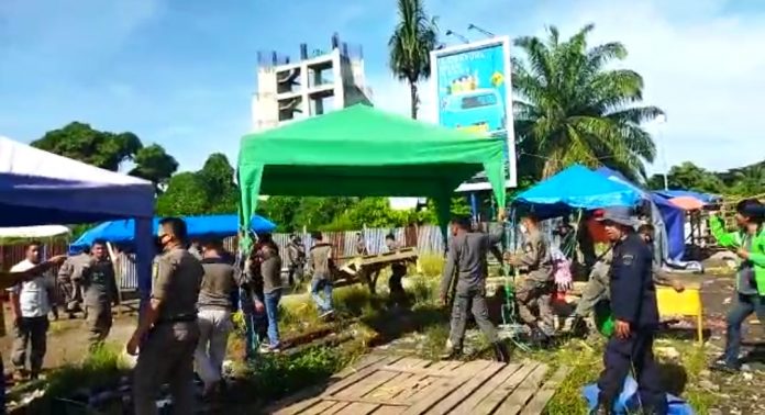 MAMUJU, MATALENSA.ID— Puluhan anggota dari dinas Satuan Polisi Pamong Praja dan Pemadam Kebakaran, kabupaten Mamuju, melakukan penertiban lapak pedagang durian di jalan Yos Sudarso, kelurahan Binanga, kecamatan Mamuju, Kabupaten Mamuju, Sulbar, Rabu, (22/2022).