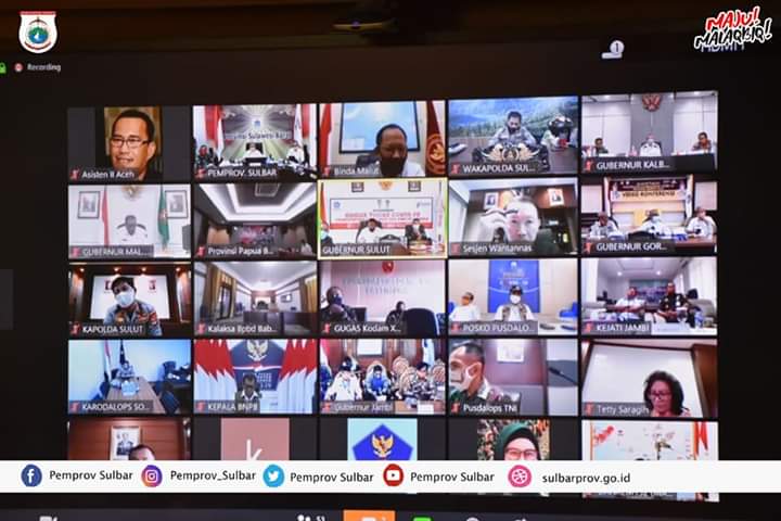 MAMUJU,MATALENSA.ID- Gubernur Sulbar, Ali Baal Masdar mengikuti rapat koordinasi percepatan operasi penanganan pandemi Covid-19, bersama Kepala BNPB RI, Letnan Jenderal TNI. Doni Monardo, selaku Ketua Gugus Tugas Percepatan Penanganan Covid-19, melalui Video Conference (VC), di ruang oval Kantor Gubernur Sulbar, Rabu, 22 April 2020.