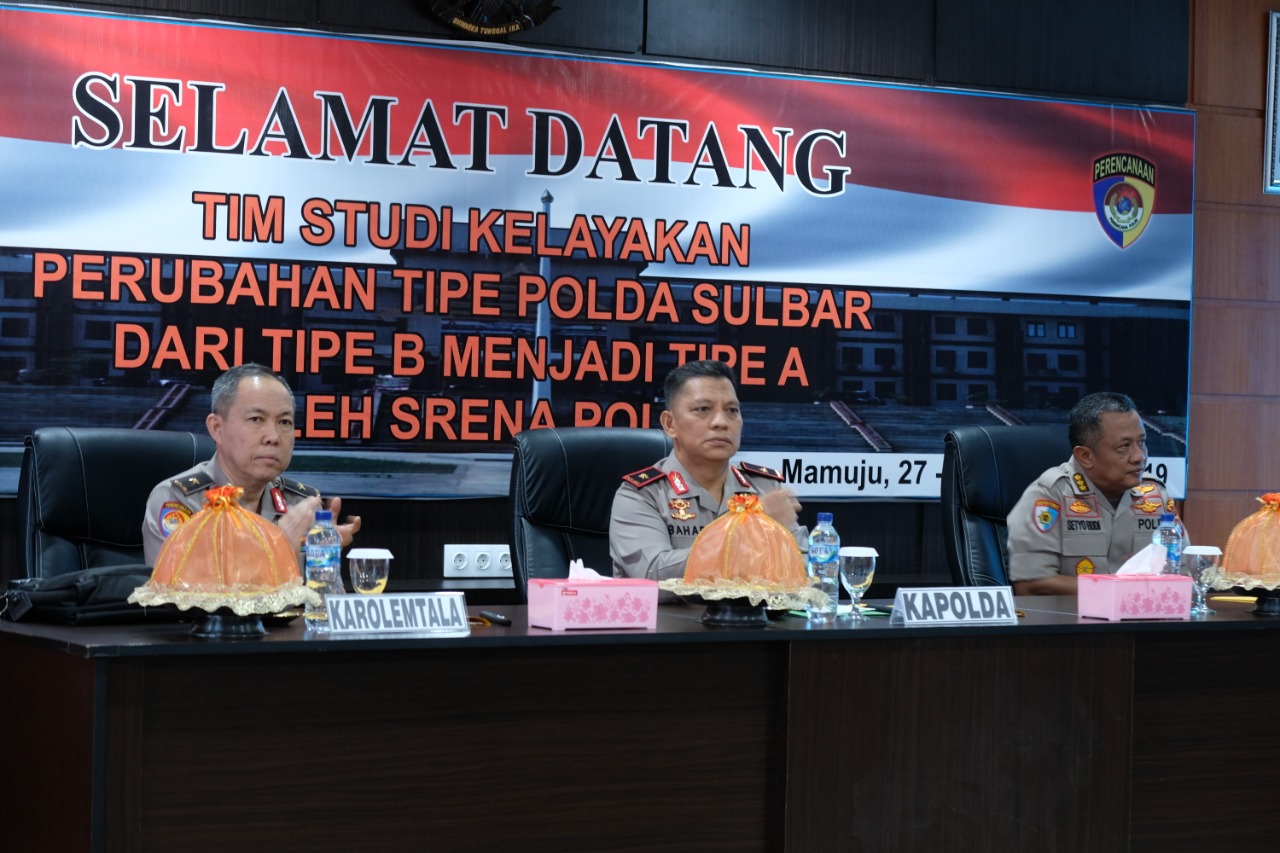 Kegiatan Studi kelayakan yang diawali dengan sambutan dan paparan serta laporan kepada tim srena Mabes Polri di Aula Arya Guna Mapolda, nampak dihadiri langsung Kapolda Sulbar Brigjen Pol Drs. Baharudin Djafar, M.Si dan dihadiri para pejabat utama dan seluruh personil yang hadir, Kamis (28/11/19).