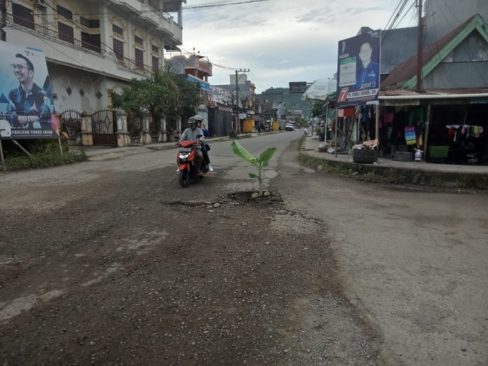 “Kami warga di sekitar jalan yang rusak parah ini menanam pohon pisang karena kami kecewa dengan pemerintah yang hingga kini belum juga memperbaiki jalan yang rusak parah ini,” ujar Irma, Jumat (8/12).